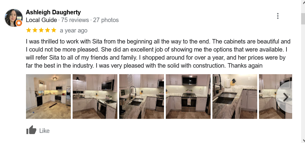 View Google reviewAshleigh DaughertyLocal Guide·75 reviews·27 photosa year agoI was thrilled to work with Sita from the beginning all the way to the end. The cabinets are beautiful and I could not be more pleased. She did an excellent job of showing me the options that were available. I will refer Sita to all of my friends and family. I shopped around for over a year, and her prices were by far the best in the industry. I was very pleased with the solid with construction. Thanks again